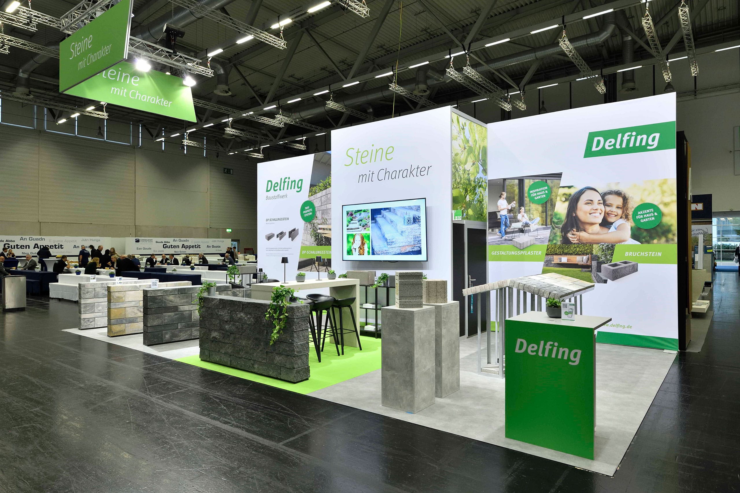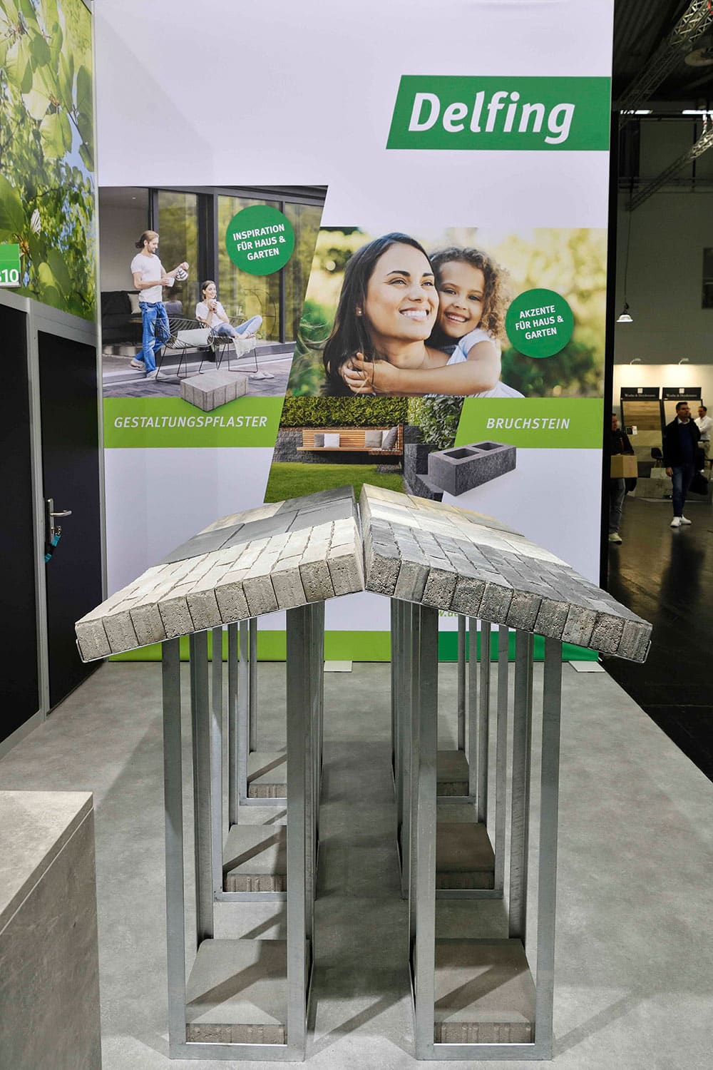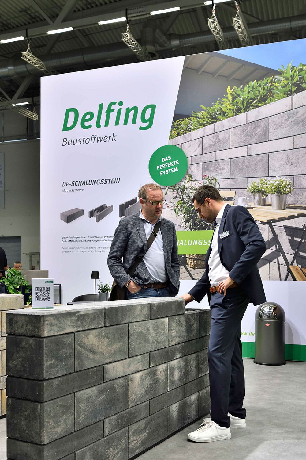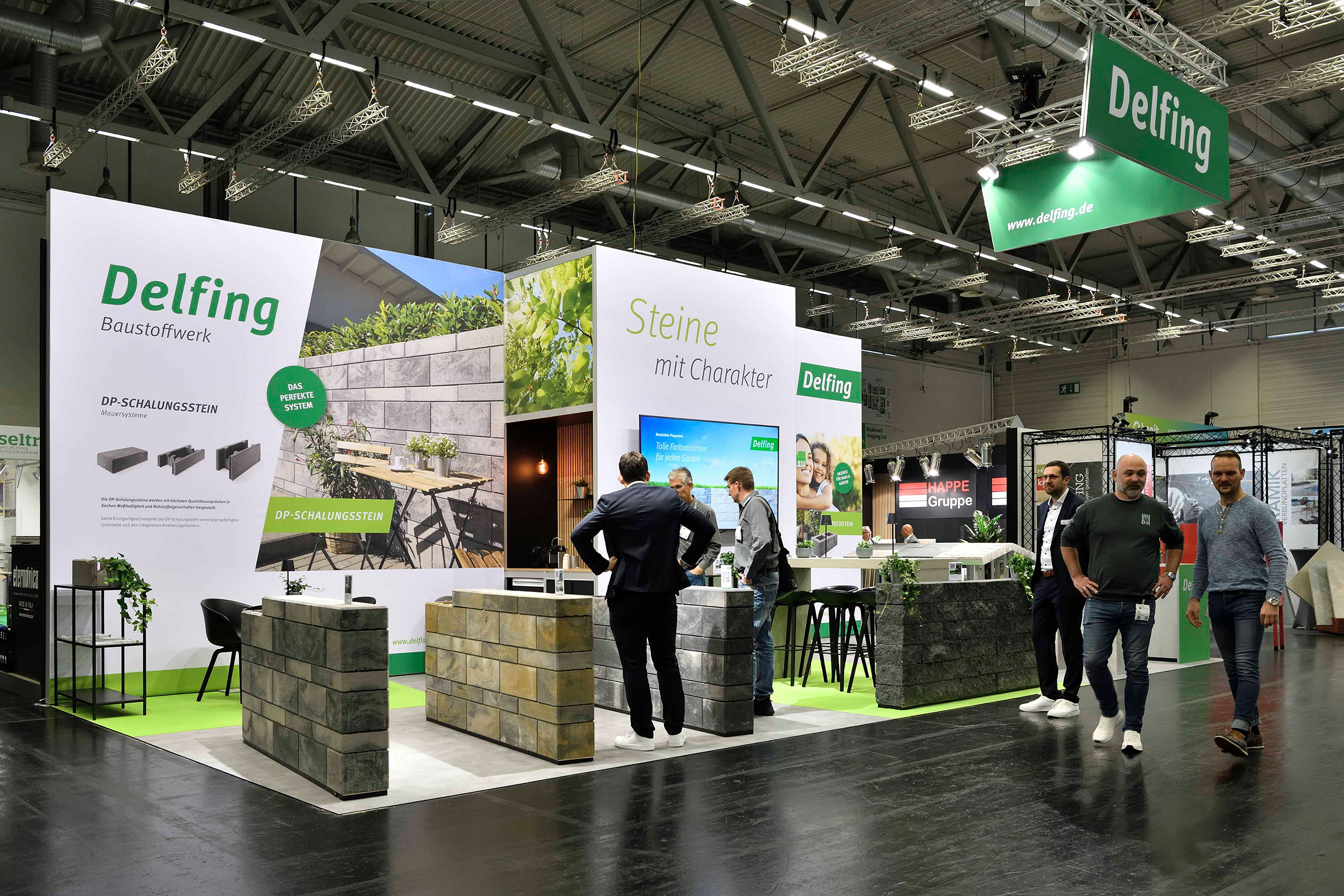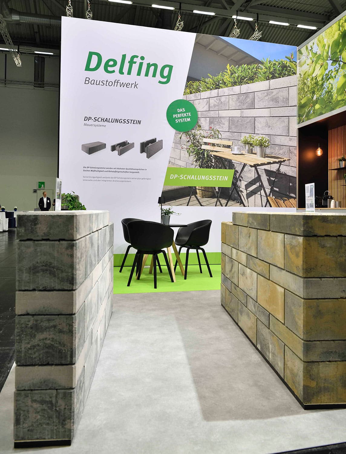 Für das Delfing Baustoffwerk realisierte Bestmann Messebau den Messeauftritt auf dem EUROBAUSTOFF Forum in Köln. Im Mittelpunkt stand das DP-Schalungssystem, ein intelligentes Mauersystem aus Hohlsteinen, das vor Ort live präsentiert wurde.